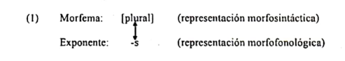 - Exponente: El morfema como secuencia de sonidos, , como entidad de naturaleza fonológica que materializa esos rasgos abstractos.