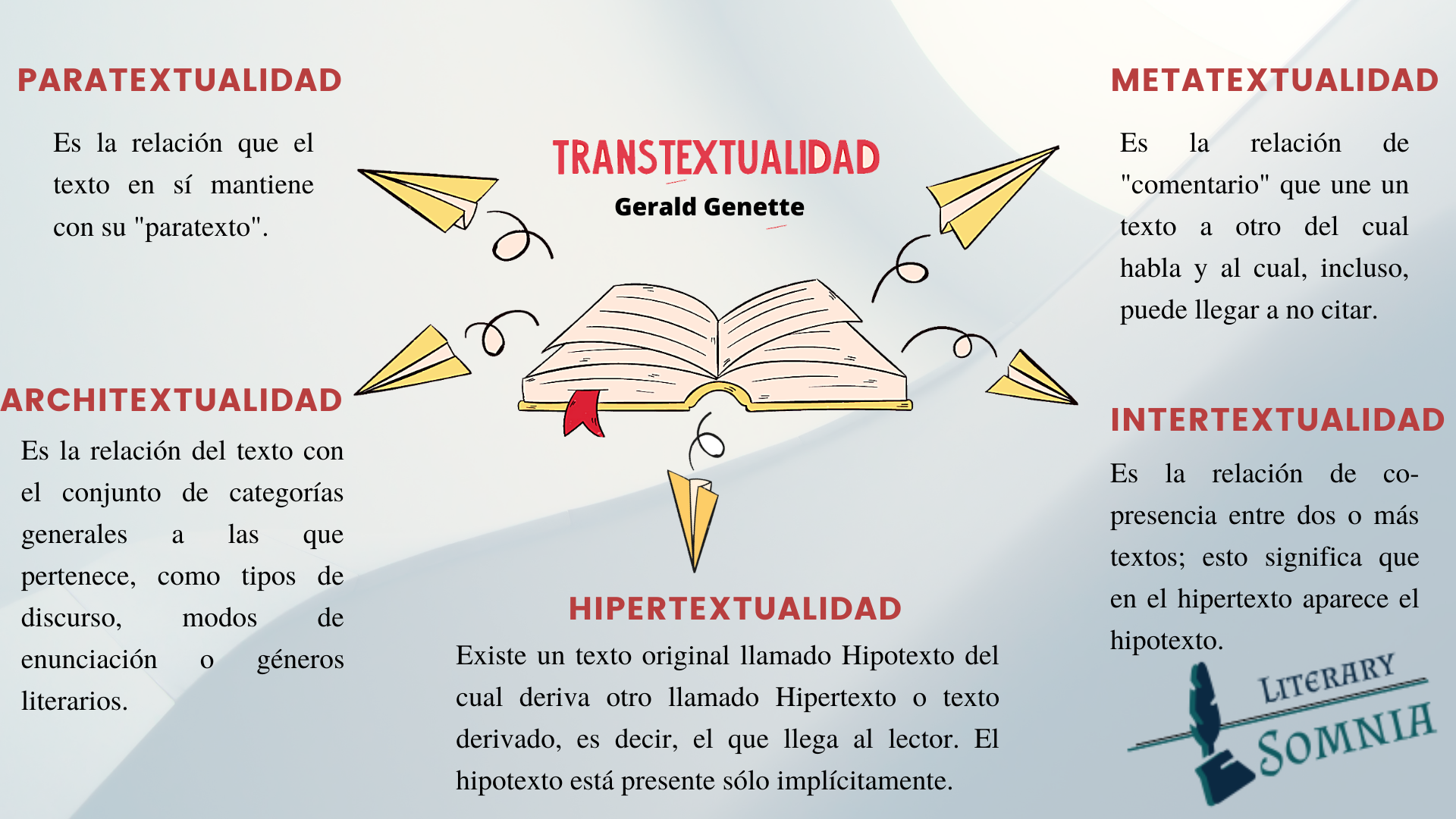 Aprende más sobre estos conceptos de transtextualidad y más sobre Gerald Genette: La intertextualidad/ La paratextualidad/ La metatextualidad/ La architextualidad/ La hipertextualidad.
