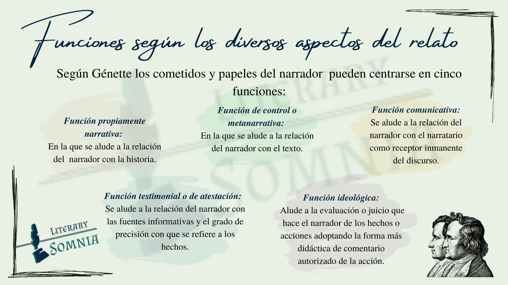 - Función propiamente narrativa: en la que se alude a la relación del narrador con la historia.