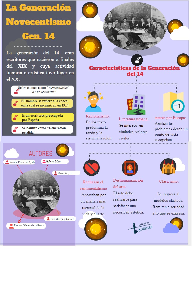 Los autores de la Generación del 14 son personalidades que nacieron a finales del XIX y cuya actividad literaria o artística tuvo lugar en el XX, en torno al 1914.