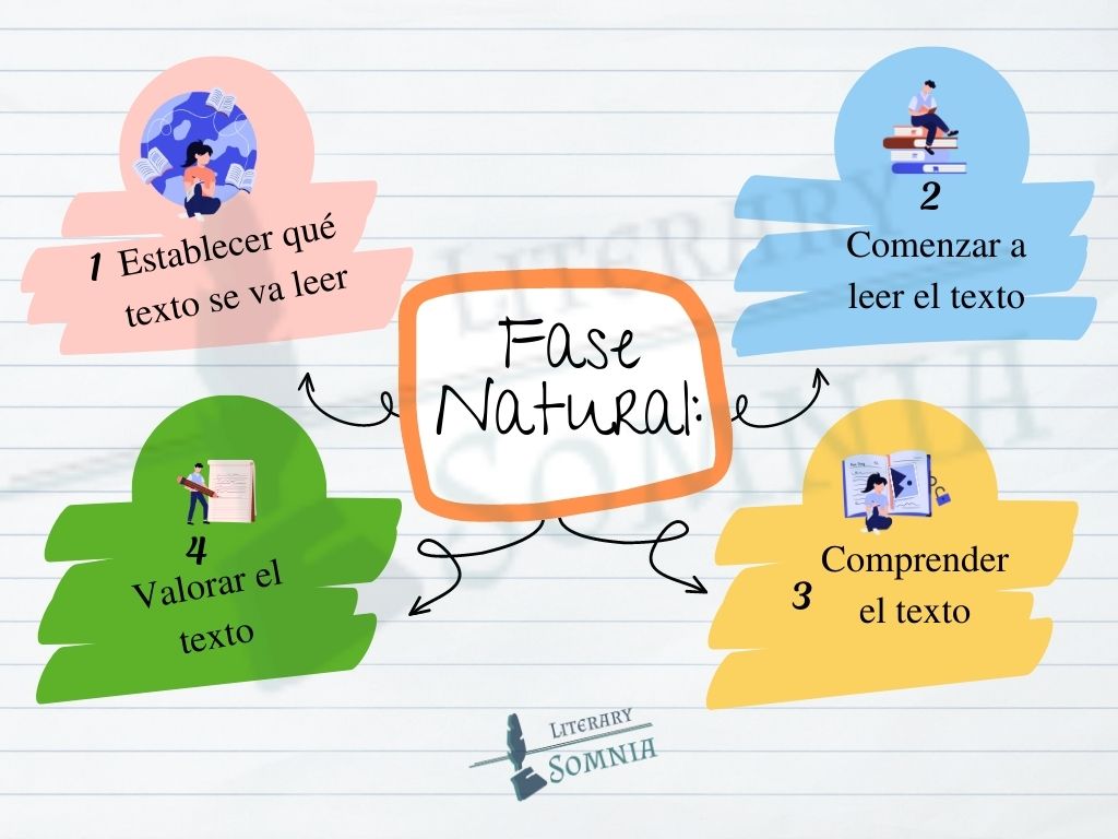 La fase natural es la primera fase consta de cuatro partes que son escoger, leer, comprender el texto y sintetizar su argumento.